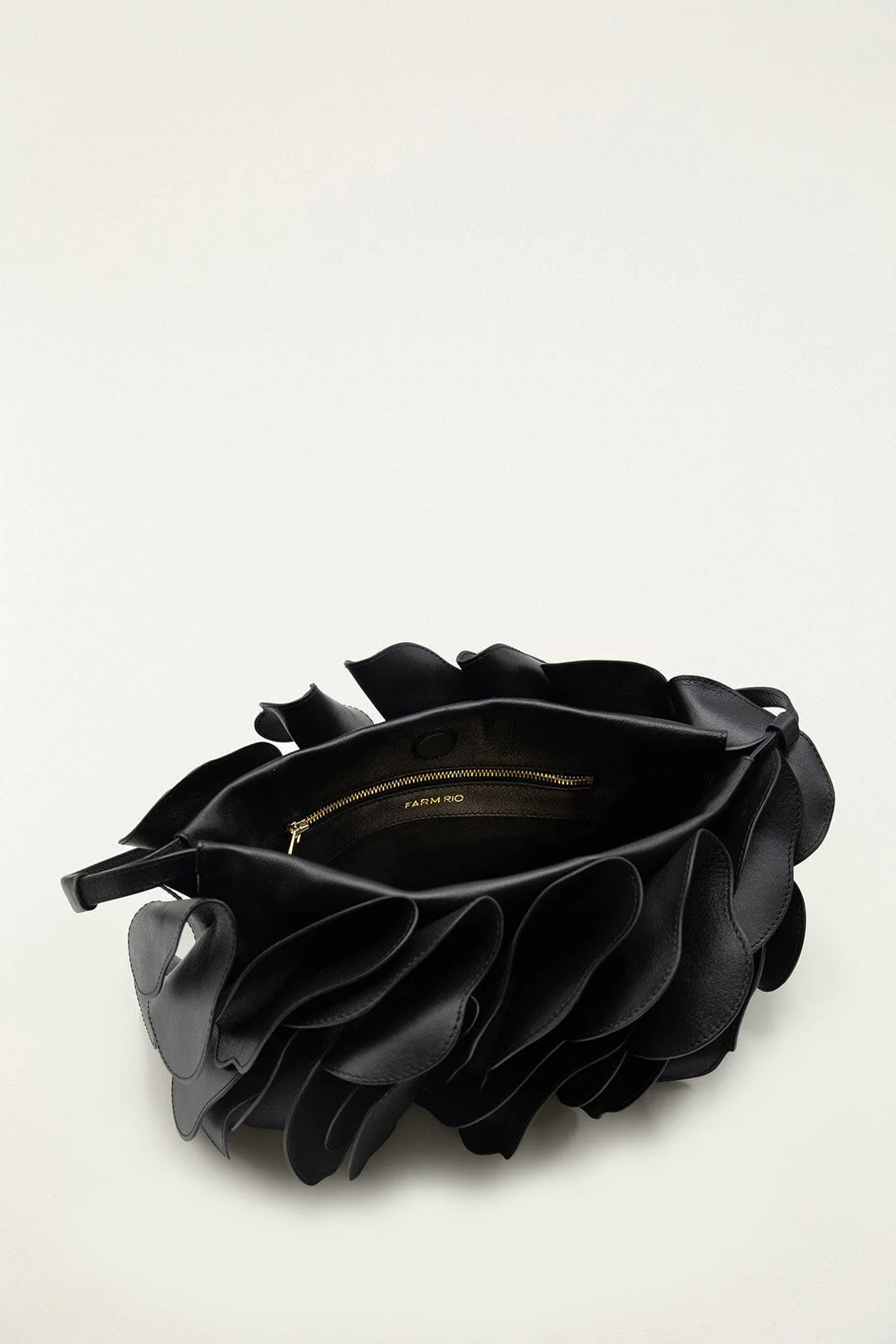 Celebrate bold femininity with this Black Leather Shoulder Flower Bag by FARM Rio. Crafted in smooth black leather, its playful silhouette bursts with oversized, sculptural petals that ripple across the body, capturing a blooming garden’s enchanting movement. The structured shoulder strap balances the voluminous floral design, creating a captivating contrast of softness and edge. This is a statement piece radiating warmth and whimsical charm for effortlessly elevating any look.