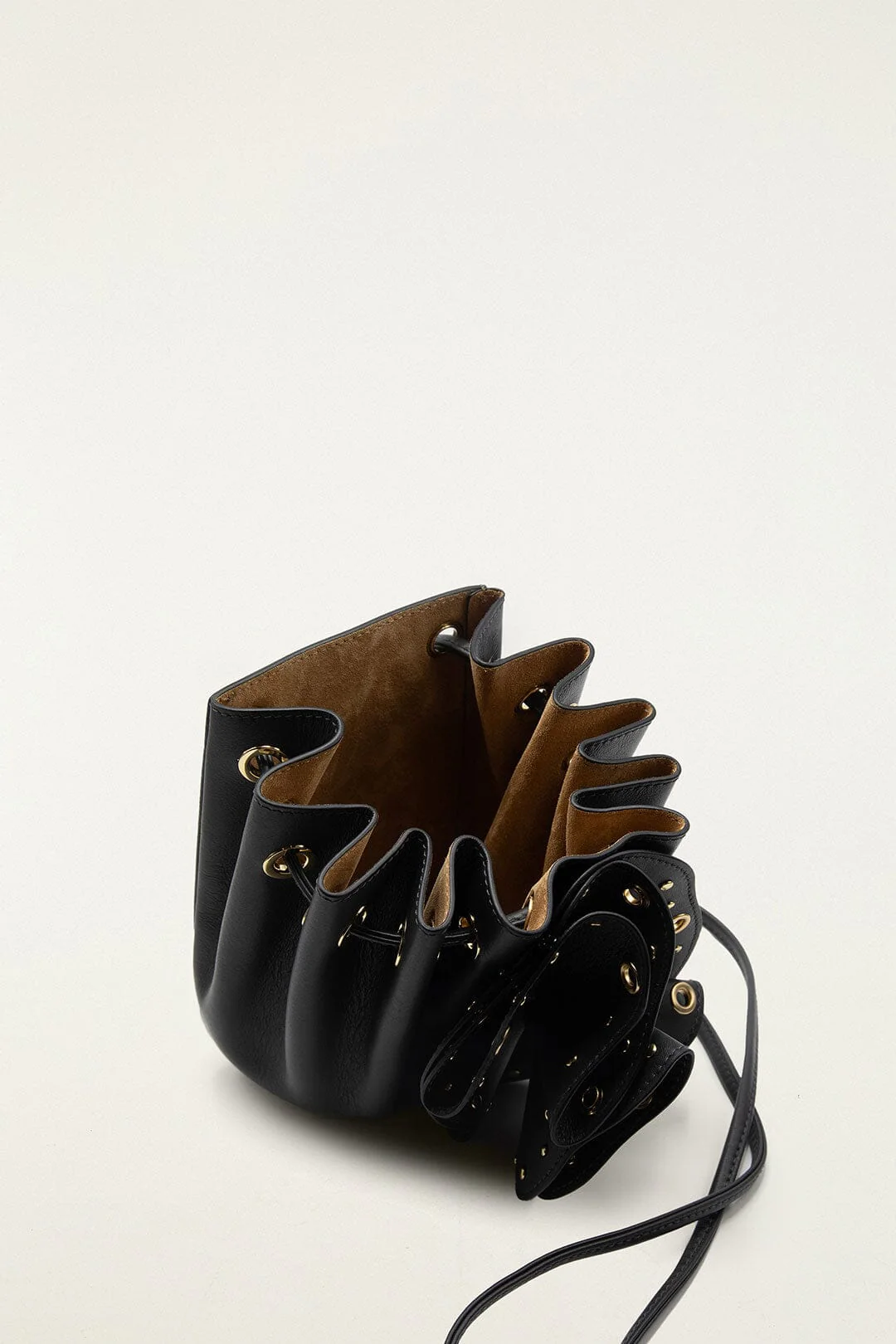 Embrace a chic edge with the Black Leather Studded Crossbody Flower Bag from FARM Rio. Crafted from smooth black leather, this playful piece blooms with a delicate flower silhouette, adorned by scattered gold studs that catch the light tenderly. Its soft, gathered body and long strap invite effortless wear, adding a touch of bold femininity to any outfit with warmth and subtle charm.