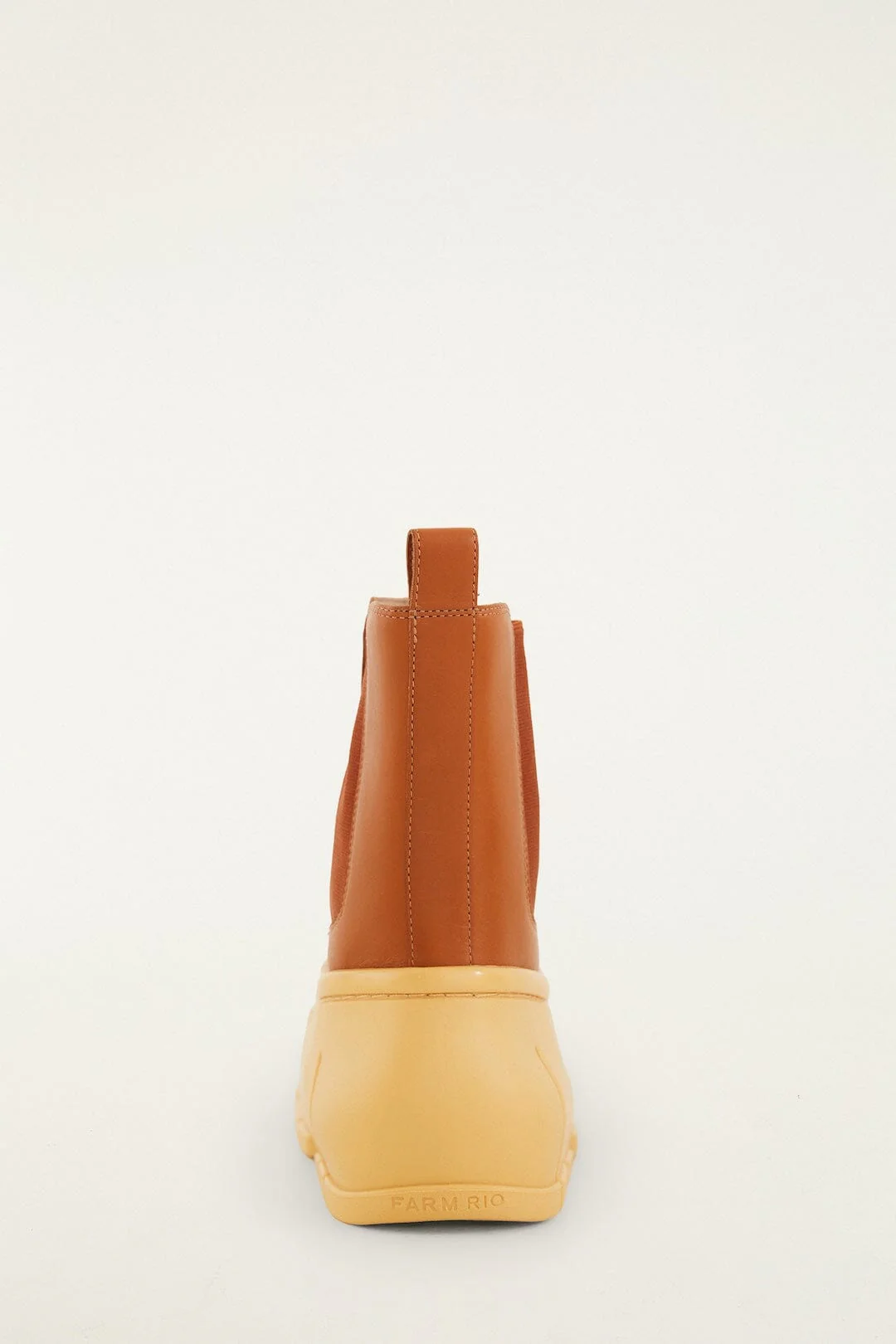 Step into playful elegance with the Butter Yellow Monstera Rain Chelsea Boot. Crafted with a vibrant butter yellow rubber base resembling natural waterproof resilience, it contrasts beautifully with the warm brown leather upper. The iconic Chelsea silhouette is reimagined with a chunky, sculptural sole featuring ridged details, evoking a tactile, organic feel. This boot blends cozy charm and bold character, perfect for brightening rainy days with a touch of FARM Rio’s joyful spirit.