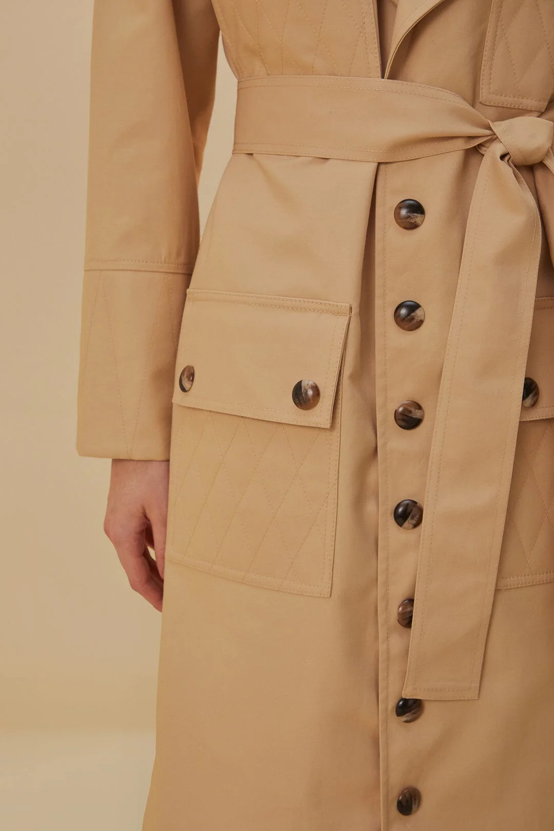 Stay chic yet functional with our Pockets Over Nude Trench Coat. Featuring center front buttons, resin button details, and patch pockets, this solid-colored outerwear is both stylish and practical. The long sleeves and collar neckline add an extra touch of sophistication to your look.